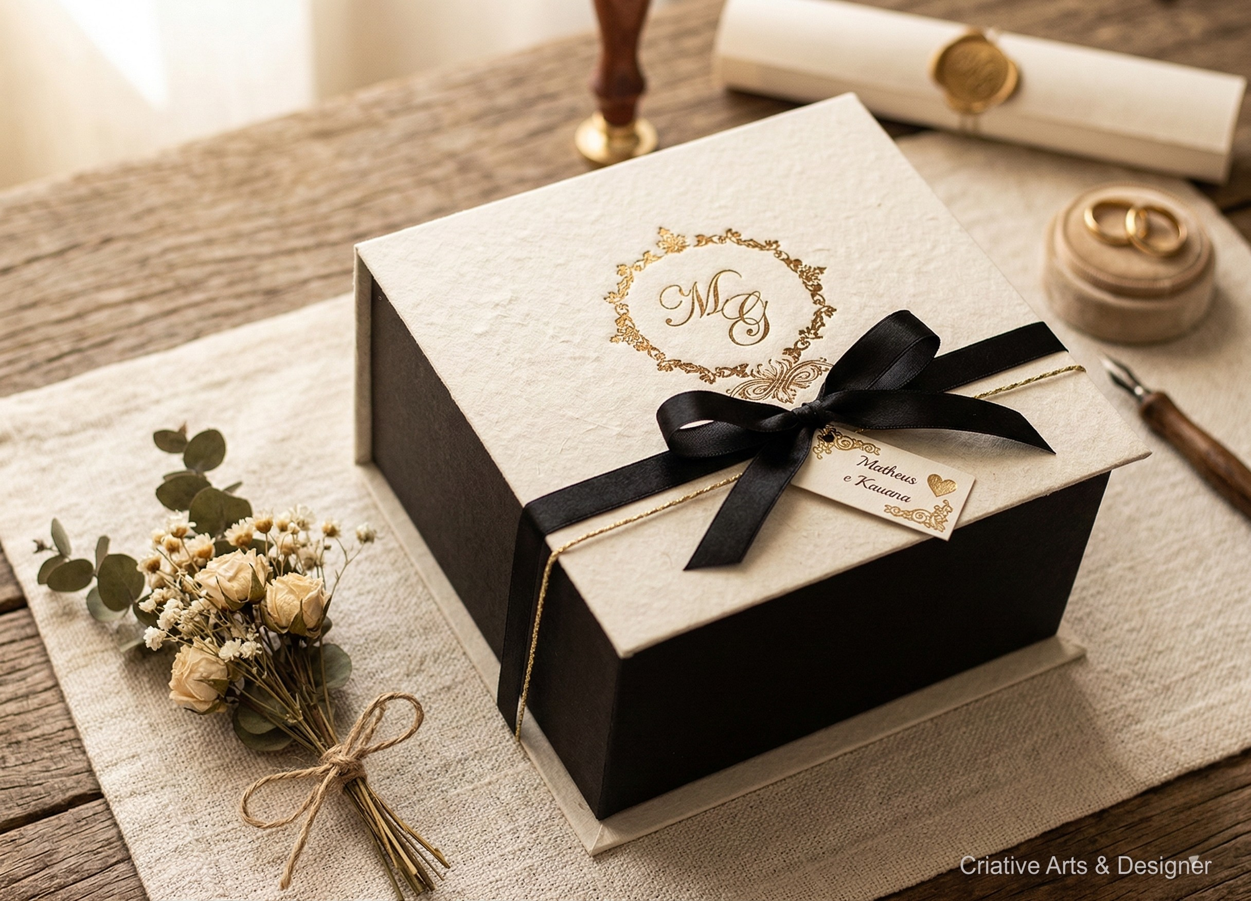 Mais do que um convite, esta caixa se torna uma lembrança especial do casamento, guardando a emoção desse momento único.